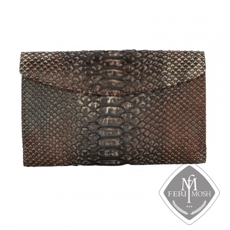 FERI MOSH- Deep brown dual sided genuine python skin pocketbook - One side flap closure opens to 2 compartments separated by a zippered pouch - Lined with nappa leather - One side strap closure opens to 1 large ID window - Space for 12 cards - 1 open slot for cas...