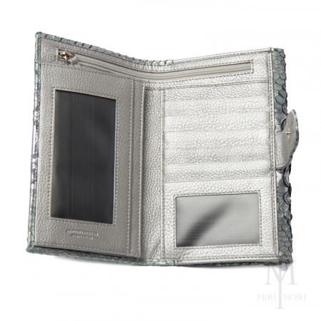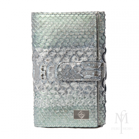 FERI MOSH- Blue metallic coloured dual sided genuine python skin pocketbook - One side flap closure opens to 2 compartments separated by a zippered pouch - Lined with nappa leather - One side strap closure opens to 1 large ID window - Space for 12 cards - 1 open ...